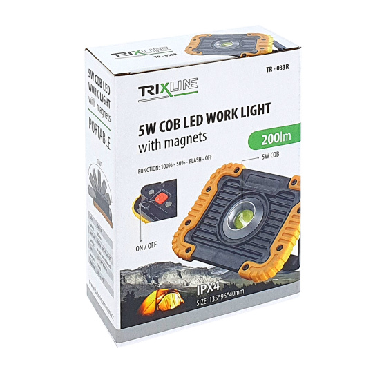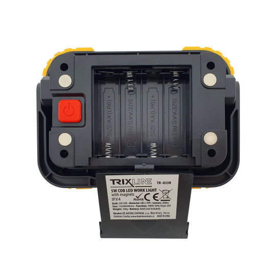 Pracovní COB LED svítilna TR-033R Trixline má 3 režimy svícení 100%/50% a problikávání. Napájená pomoci 4xAA LR6 tužkových alkalických baterií (nejsou součástí balení). Krytí IPX4 chráněno proti stříkající vodě. Zapínání na zadní straně svítilny. Lze magneticky uchytit nebo položit a upravit výšku sklonu.