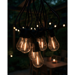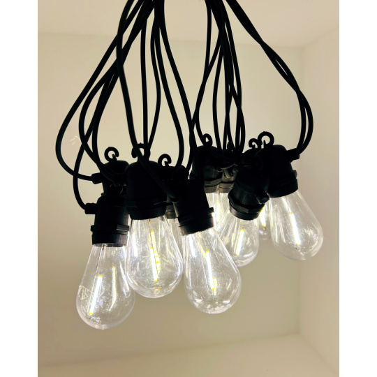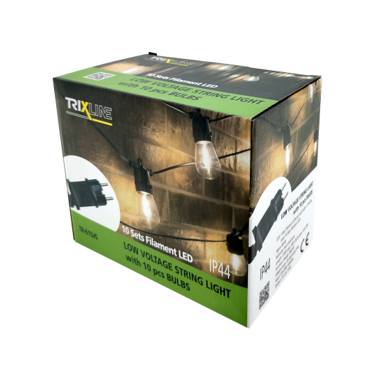 Vytvořte si příjemnou atmosféru na zahradě, terase nebo balkóně s dekorativním LED osvětlením TR-615JS. Tento světelný řetěz obsahuje 10 stylových filament žárovek v teplé bílé barvě (2700K) na celkové délce 8 metrů. Robustní plastové provedení s krytím IP44 zajišťuje odolnost vůči povětrnostním vlivům, a je tak ideální pro venkovní použití. Světelný řetěz je napájen ze sítě (220–240 V) a má bezpečný výstup 31V DC / 3,6W. Díky 3,5 metrovému přívodnímu kabelu je instalace snadná a flexibilní.