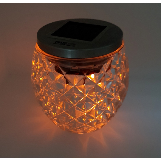 Dekorativní LED osvětlení je napájeno pomoci vestavěného solárního panelu na víku dózy. Víko je opatřeno těsnící gumou a tlačítkem on/off. Křišťálové tělo nádoby vyrobeno z vysoce odolného, kvalitně zpracovaného mozaikového skla s hmotností 600g. Ideální na zahradu, terasu, balkón, stůl, skalku apod.