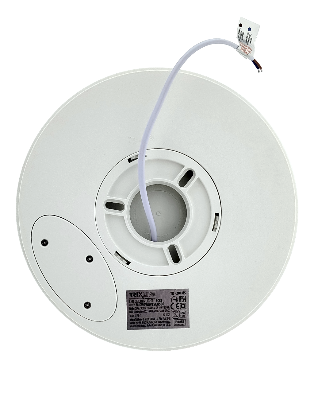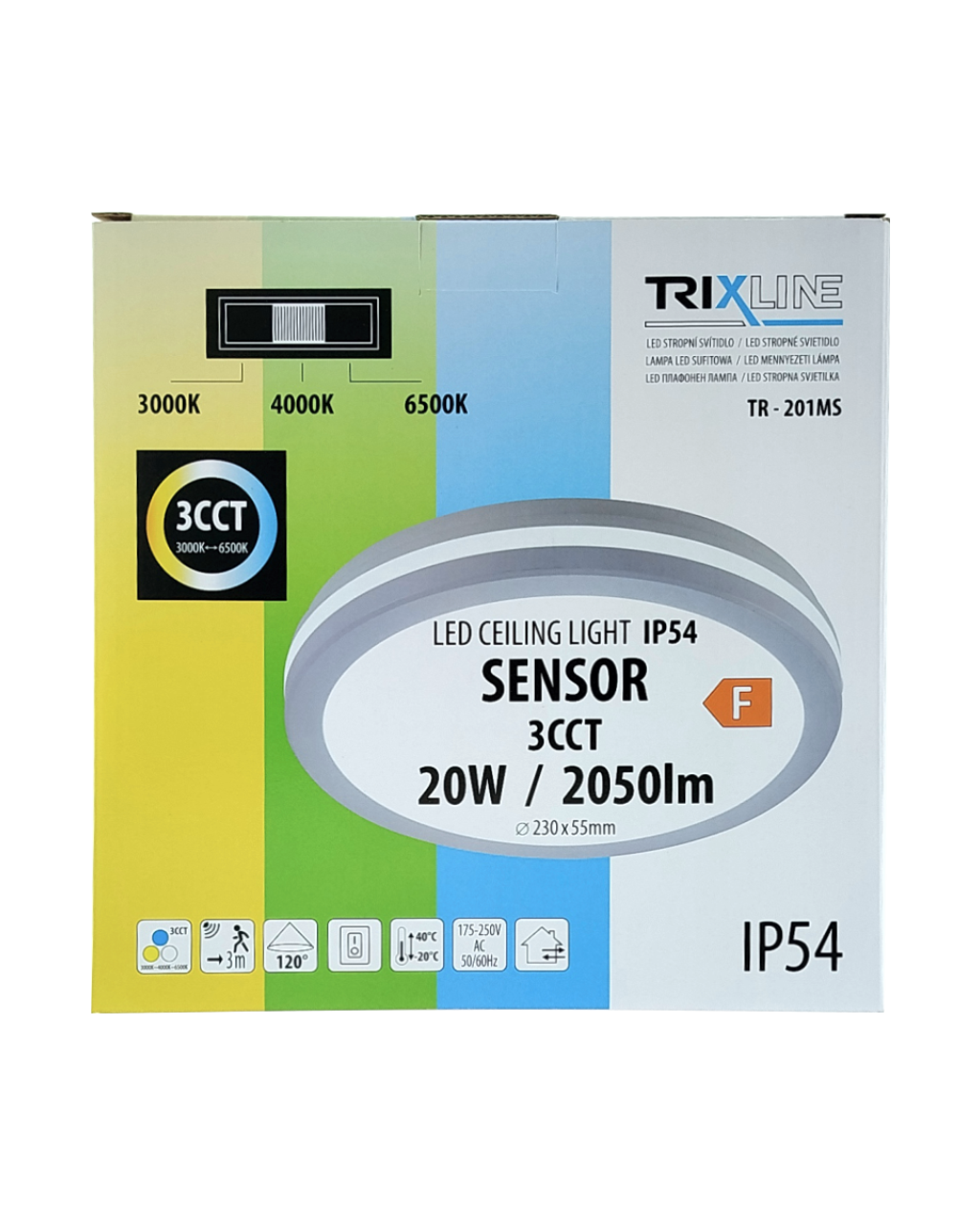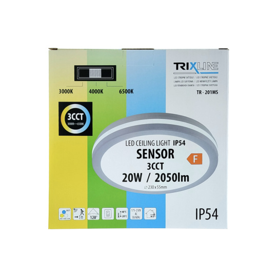 Moderní a výkonné LED CCT stropní svítidlo TR-201MS Trixline - s pohybovým senzorem poskytuje kvalitní a rovnoměrné osvětlení o síle 2050 lumenů. Nastavitelné CCT umožňuje volbu teplé, neutrální nebo studené bílé barvy světla (3000K/4000K/6500K) pro optimální přizpůsobení atmosféry prostoru. Teplota světla se nastavuje pod krytem na zadní straně pomocí posuvníku. Příjemné a efektivní osvětlení, které splní vaše estetické i praktické požadavky. Svítidlo je vybaveno pohybovým senzorem, který automaticky rozsvítí světlo při detekci pohybu. Barva světla se nastavuje na zadní straně světla pomocí posuvníku. Svítidlo lze instalovat na různých místech díky jeho univerzálním vlastnostem a krytí IP54, které zajišťuje ochranu proti prachu a stříkající vodě.