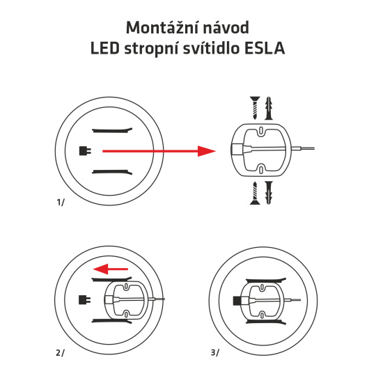 - Připevněte držák světla k pevnému podkladu např. na strop zeď apod. (součástí balení 2 šroubky, 2 hmoždinky).