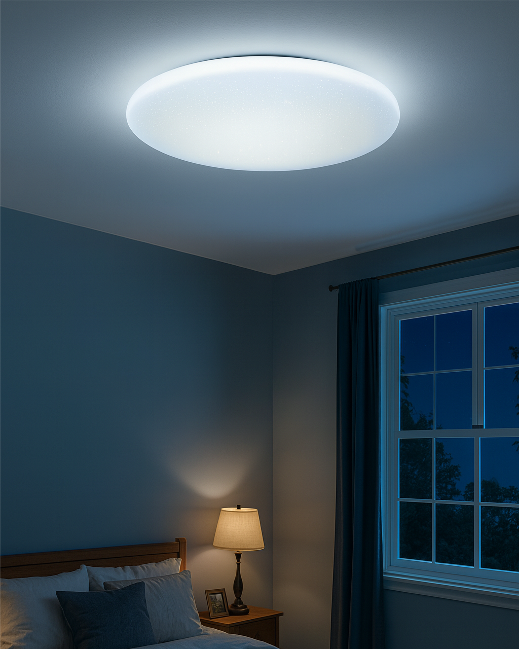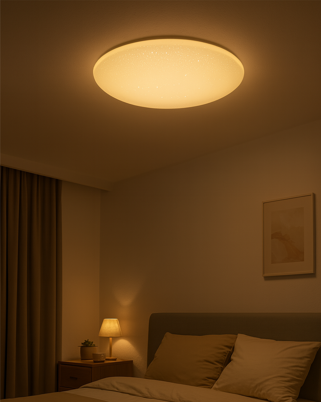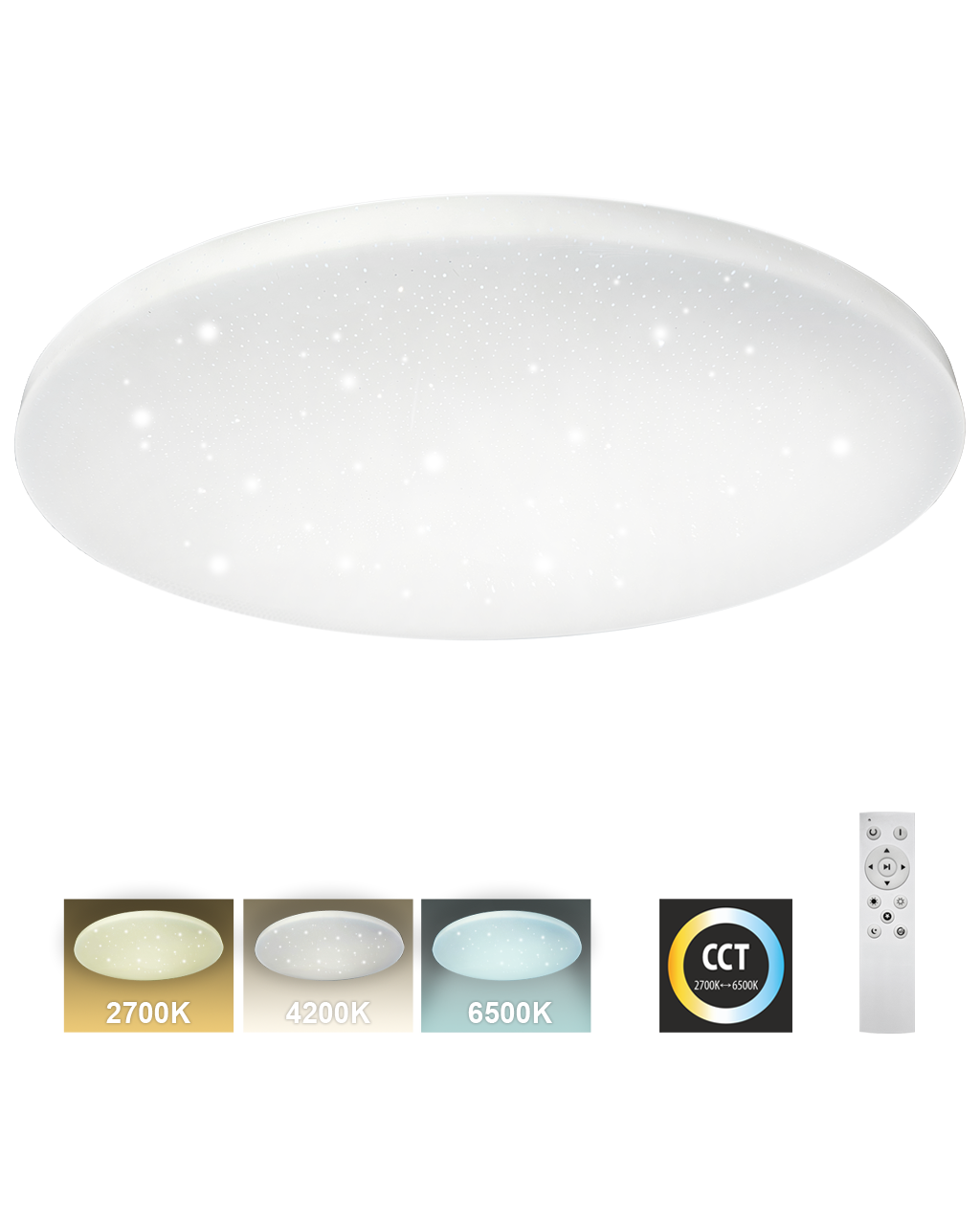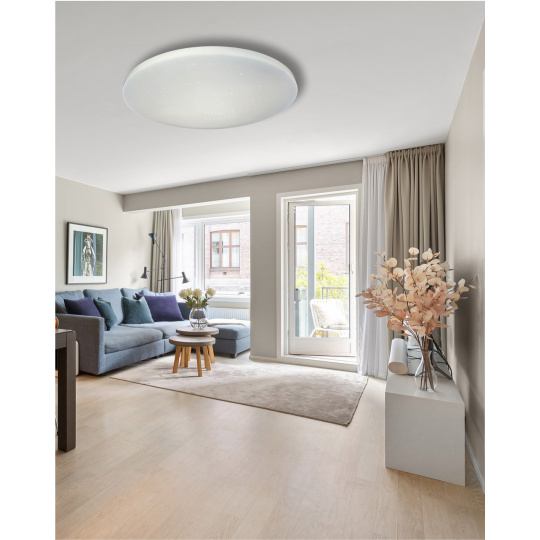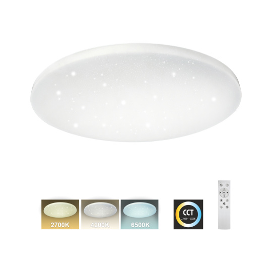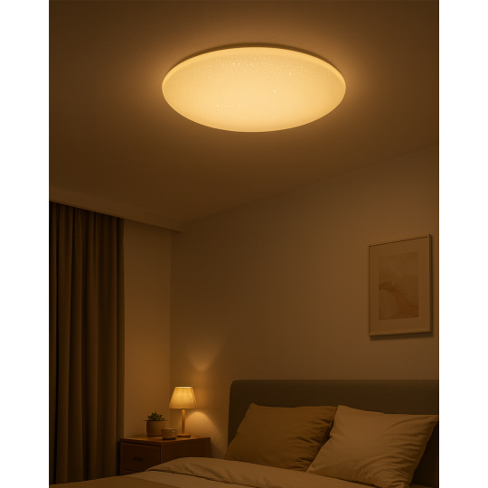 LED stropní svítidlo TR-603C - IPOLY Trixline v bílé barvě se třpytivým efektem je určeno do vnitřních prostor jako jsou obývací pokoje, ložnice, haly, kanceláře, chodby a podobná místa. Pomocí přiloženého ovladače můžete přepínat mezi třemi světelnými teplotami v rozmezí 2700K až 6500K, které lze stmívat dle potřeby pro navození příjemné atmosféry. Při maximálním ztlumení klesá spotřeba až na pouhých 14W z původních 80W, což zaručuje úsporu energie. Další možností na dálkovém ovladači je i noční režim a funkce 30 vteřin po jejichž uplynutí se LED svítidlo samo vypne. Svítidlo si po vypnutí pamatuje poslední nastavený režim, což zajišťuje pohodlné a intuitivní používání.