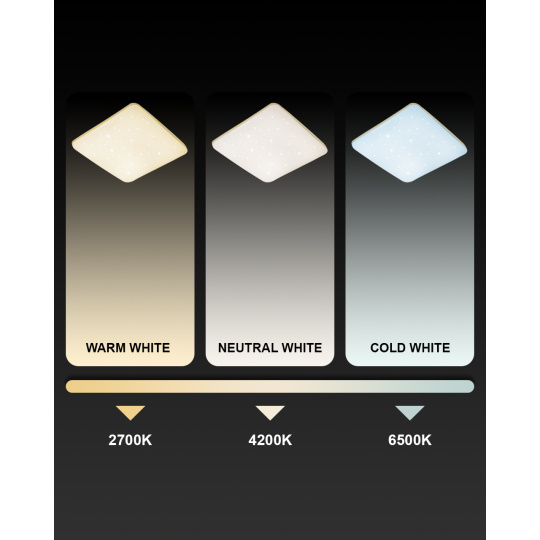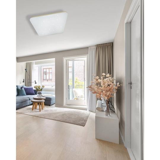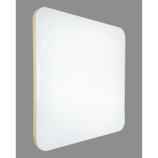 LED stropní svítidlo TR-615S - MANA Trixline v bílé barvě se čtyřmi zlatými proužky po obvodu a třpytivým světelným efektem. Svítidlo má variabilní design, kdy můžete odejmout zlaté proužky a ponechat pouze čistě bílé okraje. Je určeno do vnitřních prostor jako jsou obývací pokoje, ložnice, haly, kanceláře, chodby a podobná místa. Pomocí přiloženého ovladače můžete přepínat mezi třemi světelnými teplotami v rozmezí 2700K až 6500K, které lze stmívat dle potřeby pro navození příjemné atmosféry. Při maximálním ztlumení klesá spotřeba až na pouhých 8W z původních 60W, což zaručuje úsporu energie. Další možností na dálkovém ovladači je i noční režim a funkce 30 vteřin po jejichž uplynutí se LED svítidlo samo vypne. Svítidlo si po vypnutí pamatuje poslední nastavený režim, což zajišťuje pohodlné a intuitivní používání.