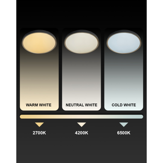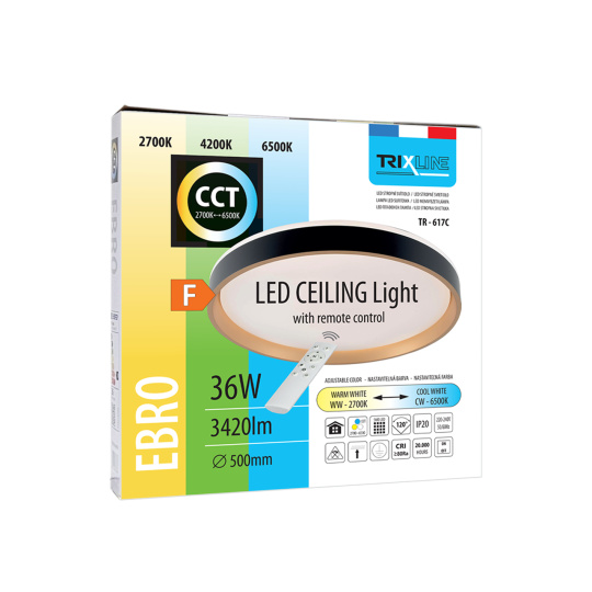 LED stropní svítidlo TR-617C - EBRO Trixline v černé barvě se zlatým lemem je určeno do vnitřních prostor jako jsou obývací pokoje, ložnice, haly, kanceláře, chodby a podobná místa. Pomocí přiloženého ovladače můžete přepínat mezi třemi světelnými teplotami v rozmezí 2700K až 6500K, které lze stmívat dle potřeby pro navození příjemné atmosféry. Při maximálním ztlumení klesá spotřeba až na pouhých 6W z původních 36W, což zaručuje úsporu energie. Další možností na dálkovém ovladači je i noční režim a funkce 30 vteřin po jejichž uplynutí se LED svítidlo samo vypne. Svítidlo si po vypnutí pamatuje poslední nastavený režim, což zajišťuje pohodlné a intuitivní používání.