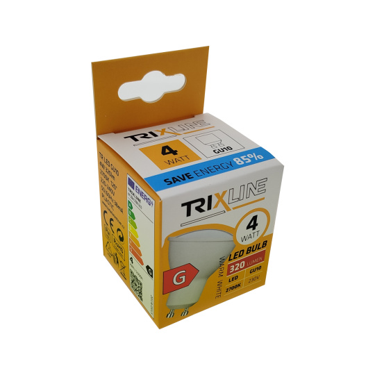 Úsporná LED žárovka Trixline s paticí GU10, šetrná k životnímu prostředí, neobsahuje žádnou rtuť ani olovo, navíc se dobře osvědčuje i při extrémně nízkých i vysokých teplotách, kdy s vláknovými žárovkami bývají problémy. Její životnost dosahuje až 30 000 hodin. Díky svému výkonu 4W výborně poslouží jako náhrada za klasickou 34W žárovku. LED žárovka se po zapnutí okamžitě rozsvítí bez jakékoliv prodlevy a vyzařuje příjemné teplé bílé světlo 2700K.