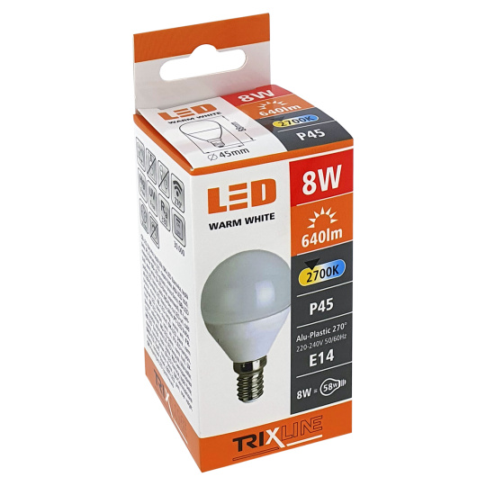 LED izzó Trixline 8W E14 P45 meleg fehér