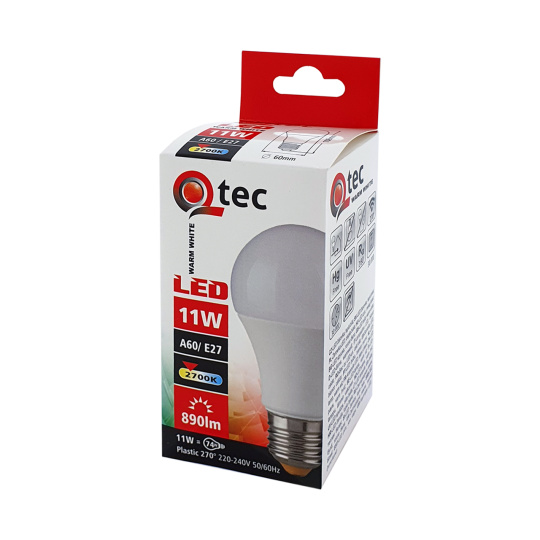 LED ŽÁROVKA Q tec je úsporná LED žárovka s paticí E27, šetrná k životnímu prostředí, neobsahuje totiž žádnou rtuť ani olovo, navíc se dobře osvědčuje i při extrémně nízkých i vysokých teplotách, kdy s vláknovými žárovkami bývají problémy. Její životnost dosahuje až 30 000 hodin. Díky svému výkonu 11 W výborně poslouží jako náhrada za klasickou 74W žárovku. LED žárovka se po zapnutí okamžitě rozsvítí bez jakékoliv prodlevy a vyzařuje příjemné teplé bílé světlo 2700K.