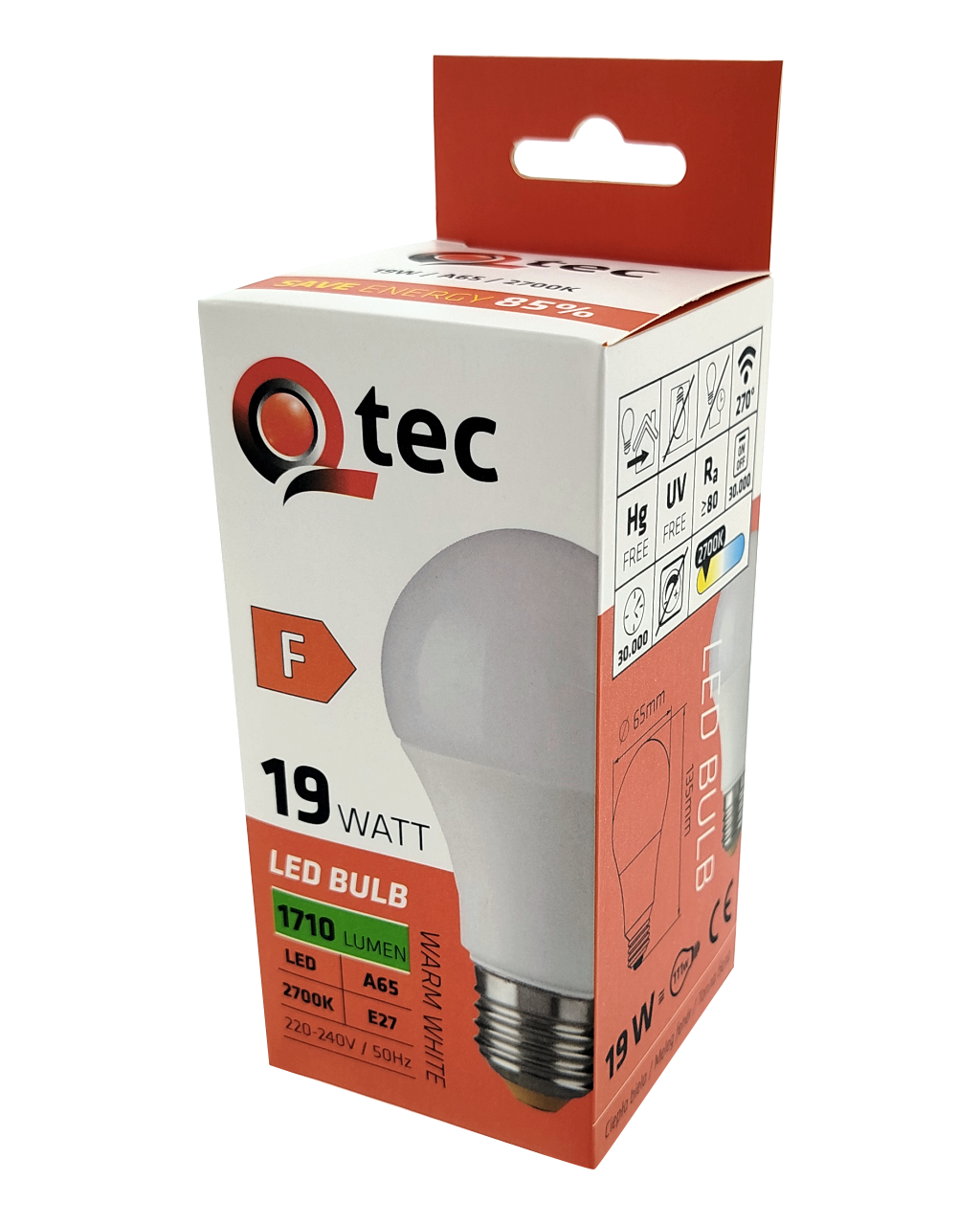 LED ŽÁROVKA Q-tec je úsporná LED žárovka s paticí E27, šetrná k životnímu prostředí, neobsahuje totiž žádnou rtuť ani olovo, navíc se dobře osvědčuje i při extrémně nízkých i vysokých teplotách, kdy s vláknovými žárovkami bývají problémy. Její životnost dosahuje až 30 000 hodin. LED žárovka se po zapnutí okamžitě rozsvítí bez jakékoliv prodlevy a vyzařuje příjemné teplé bílé světlo 2700K.