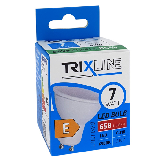 Úsporná LED žárovka Trixline s paticí GU10, šetrná k životnímu prostředí, neobsahuje žádnou rtuť ani olovo, navíc se dobře osvědčuje i při extrémně nízkých i vysokých teplotách, kdy s vláknovými žárovkami bývají problémy. Její životnost dosahuje až 30 000 hodin. Díky svému výkonu 7W výborně poslouží jako náhrada za klasickou 62W žárovku. LED žárovka se po zapnutí okamžitě rozsvítí bez jakékoliv prodlevy a vyzařuje příjemné studené bílé světlo 6500K.