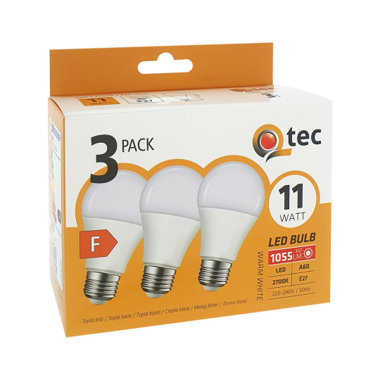 LED izzó 11W/1055lm/A60/E27 meleg fehér 3 PACK Qtec