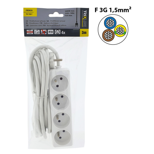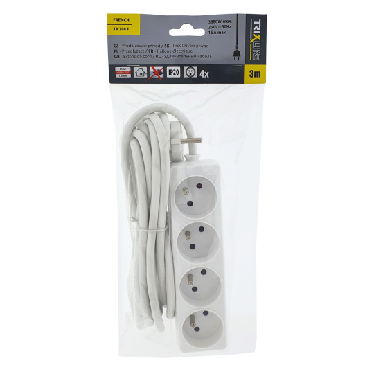 Trixline přívod TR 708 F slouží k prodloužení elektrické energie tam, kam pevná zásuvka nedosáhne. Disponuje 4 zásuvkami.