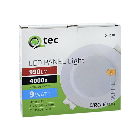 Kruhový vestavný LED panel Qtec Q-102P o výkonu 9W se světelným tokem 990lm a neutrální bílou barvou světla 4000K. Panel je vyroben z plastu. Díky použité LED technologii ušetříte až 85% energie. Je určen do interiéru k zapuštění do sádrokartónu s montážním otvorem o průměru 11cm. Vnější rozměr světla je ø14,5x2,84cm. Rychlá a snadná instalace pomocí vodičů L a N (není potřeba trafo).