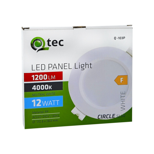 Kruhový vestavný LED panel Qtec Q-103P o výkonu 12W se světelným tokem 1200lm a neutrální bílou barvou světla 4000K. Panel je vyroben z plastu. Díky použité LED technologii ušetříte až 85% energie. Je určen do interiéru k zapuštění do sádrokartónu s montážním otvorem o průměru 12,6cm. Vnější rozměr světla je ø170,8x28,4cm. Rychlá a snadná instalace pomocí vodičů L a N (není potřeba trafo).