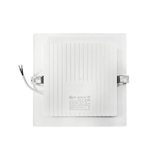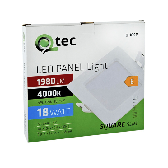 Čtvercový vestavný LED panel Qtec Q-109P o výkonu 18W se světelným tokem 1980lm a neutrální bílou barvou světla 4000K. Panel je vyroben z plastu. Díky použité LED technologii ušetříte až 85% energie. Je určen do interiéru k zapuštění do sádrokartónu s montážním otvorem 16,9x16,9cm. Vnější rozměr světla je 22,04x22,04x2,88cm. Rychlá a snadná instalace pomocí vodičů L a N (není potřeba trafo).