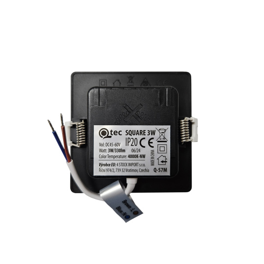 Čtvercový vestavný LED panel Qtec Q-57M o výkonu 3W se světelným tokem 330lm a neutrální bílou barvou světla 4000K. Panel je vyroben z plastu. Díky použité LED technologii ušetříte až 85% energie. Je určen do interiéru k zapuštění do sádrokartónu s montážním otvorem 6,8x6,8cm. Vnější rozměr světla je 9x9x2,82cm. Rychlá a snadná instalace pomocí vodičů L a N (nemá trafo).