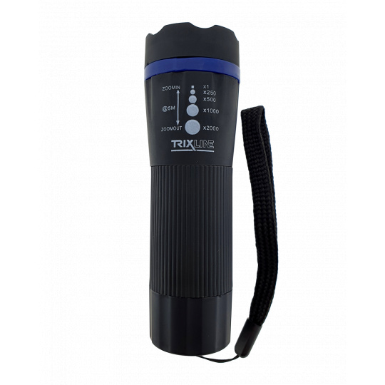 Ruční LED svítilna se zoomem. Vyniká především svou vysokou svítivostí, nastavitelnou šířkou světelného kuželu a dosvitem až 5m. Režim svícení ON/OFF, zoom x1/x250/x500/x1000/x2000.