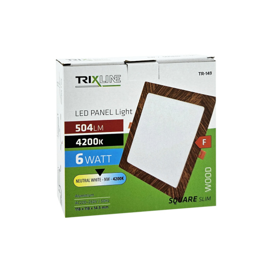 Trixline TR-149 négyzet alakú beépített LED panel 6W teljesítménnyel, 504lm fényárammal és 4200K semleges fehér fényszínnel. Lenyűgöző dizájn fa dekorációban. A panel kiváló minőségű alumíniumból készült. Az alkalmazott LED technológiának köszönhetően akár 85%-os energiamegtakarítást is elérhet. Beltéri használatra készült, gipszkartonba ágyazva, 10,3x10,3 cm-es rögzítőlyukkal. A lámpa külső mérete 11,8x11,8x1,45 cm. Gyors és egyszerű telepítés.