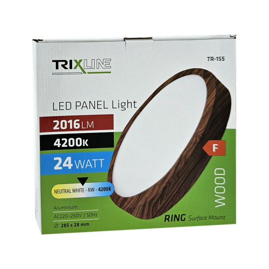 Trixline TR-155 kör alakú LED panel 24W teljesítménnyel, 2016lm fényárammal és 4200K semleges fehér fényszínnel. Lenyűgöző dizájn fa dekorációban. A panel kiváló minőségű alumíniumból készült. Az alkalmazott LED technológiának köszönhetően akár 85%-os energiamegtakarítást is elérhet. Belső használatra készült. A lámpa külső mérete ø28,5x2,8 cm. Gyors és egyszerű telepítés.