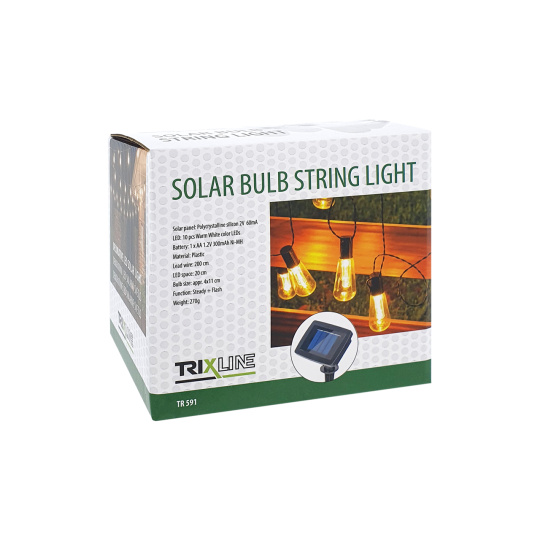 Dekorativní LED solární, venkovní osvětlení (řetěz/girlanda) TR-591 Trixline. Vytváří příjemnou atmosféru zahrady, pergoly, altánku, terasy, balkónu apod. Lze volně položit na stoly, parapety, police nebo zavěsit na zábradlí, ploty, slunečníky, stromy, sloupy, omotat na trámy nebo prověsy u stropu či volně do prostoru. Černý kabel o délce 2m je tvořen 10ti LED plastovými, podlouhlými, průhlednými žárovkami, vyzařují teplou barvu světla. Výhodou plastových žárovek oproti skleněným je jejich nerozbitnost, odolnost, nízká hmotnost a delší životnost. Díky solárnímu panelu ušetříte energii a nejste omezeni připojením do elektrické sítě. Ve dne se nabíjí a v noci rozsvítí. Má volitelné 2 režimy svícení (S) stabilní a (F) blikající.